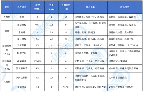 高倍甜味剂(三氯蔗糖、甜菊糖苷):甜度高、成本低,但通常需复配使用以掩盖不良风味,且部分产品面临“人工合成”的标签争议。